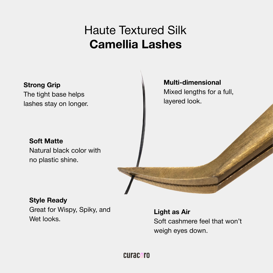 Create the most in-demand textured styles with the Haute Textured Camellia Collection. Specifically designed for Anime, Wispy, and Wet-Look sets, these 0.07 lashes feature a precision-layered structure that mimics natural lash growth for instant depth and fluttery volume.