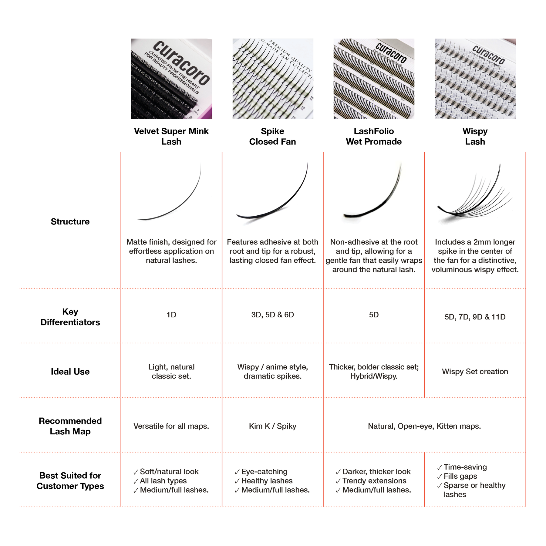 Available in C, CC, and D curls with Mix 8mm–11mm, Mix 12mm–15mm, and Mix 7mm–15mm, crafted in 0.07mm diameter and made formaldehyde-free, latex-free, vegan, and cruelty-free.